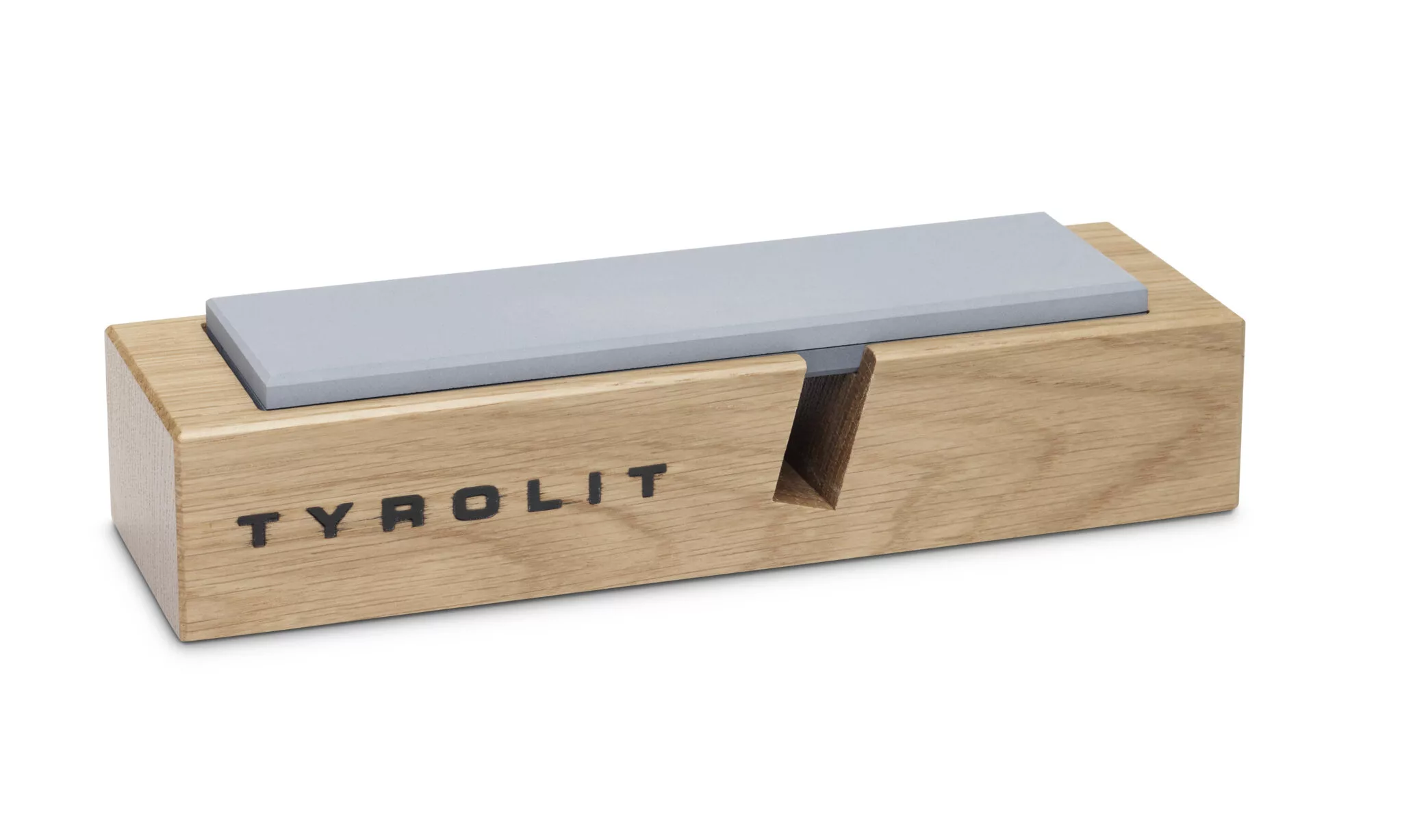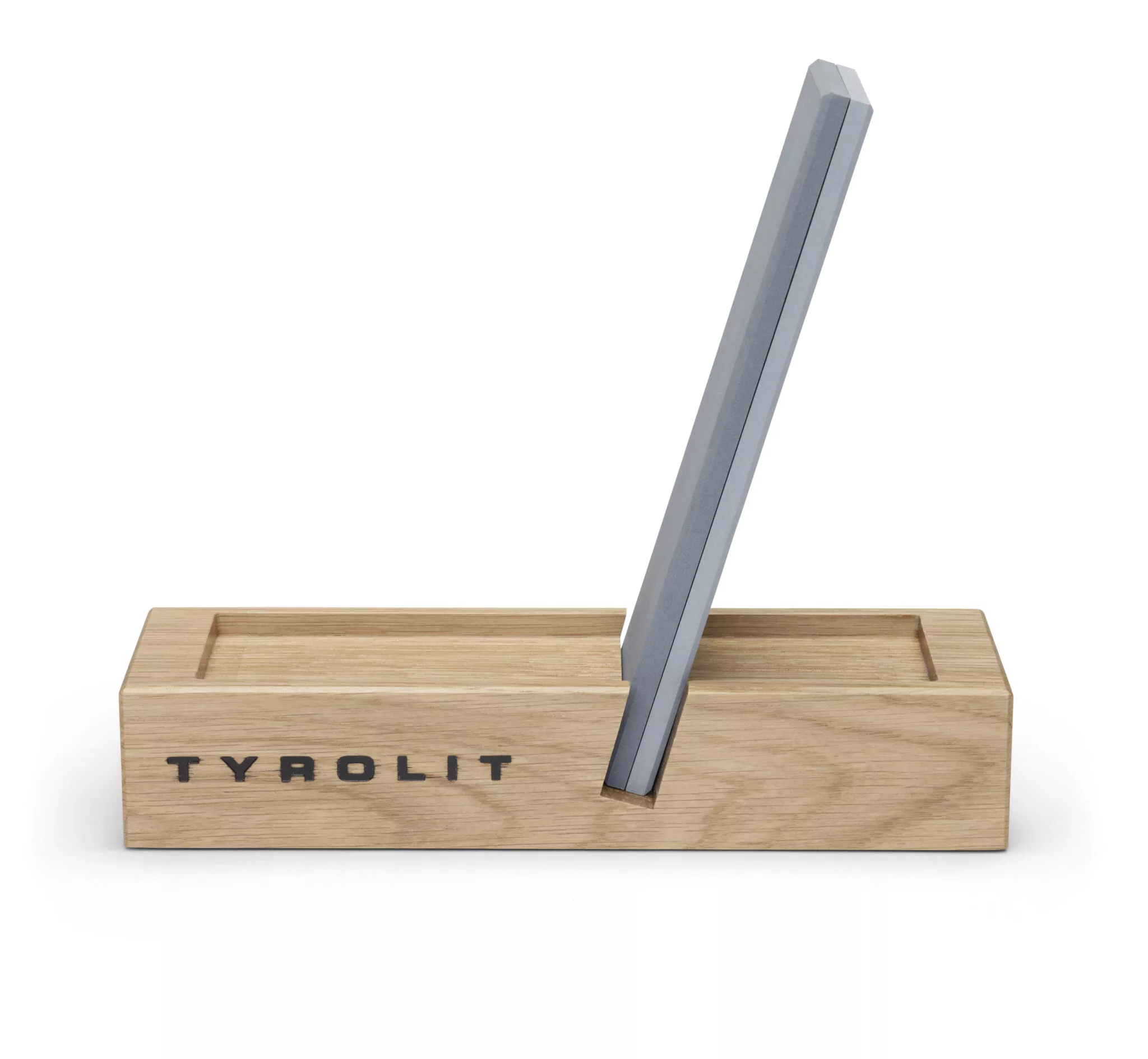 A unique innovation of all TYROLIT LIFE knife sharpeners is the pre-set sharpening angle of 15 degrees. This allows for professional sharpening quickly and effortlessly by anyone. For optimal sharpening results, moisten the stones before use. Hold the knife at a right angle to the base surface.