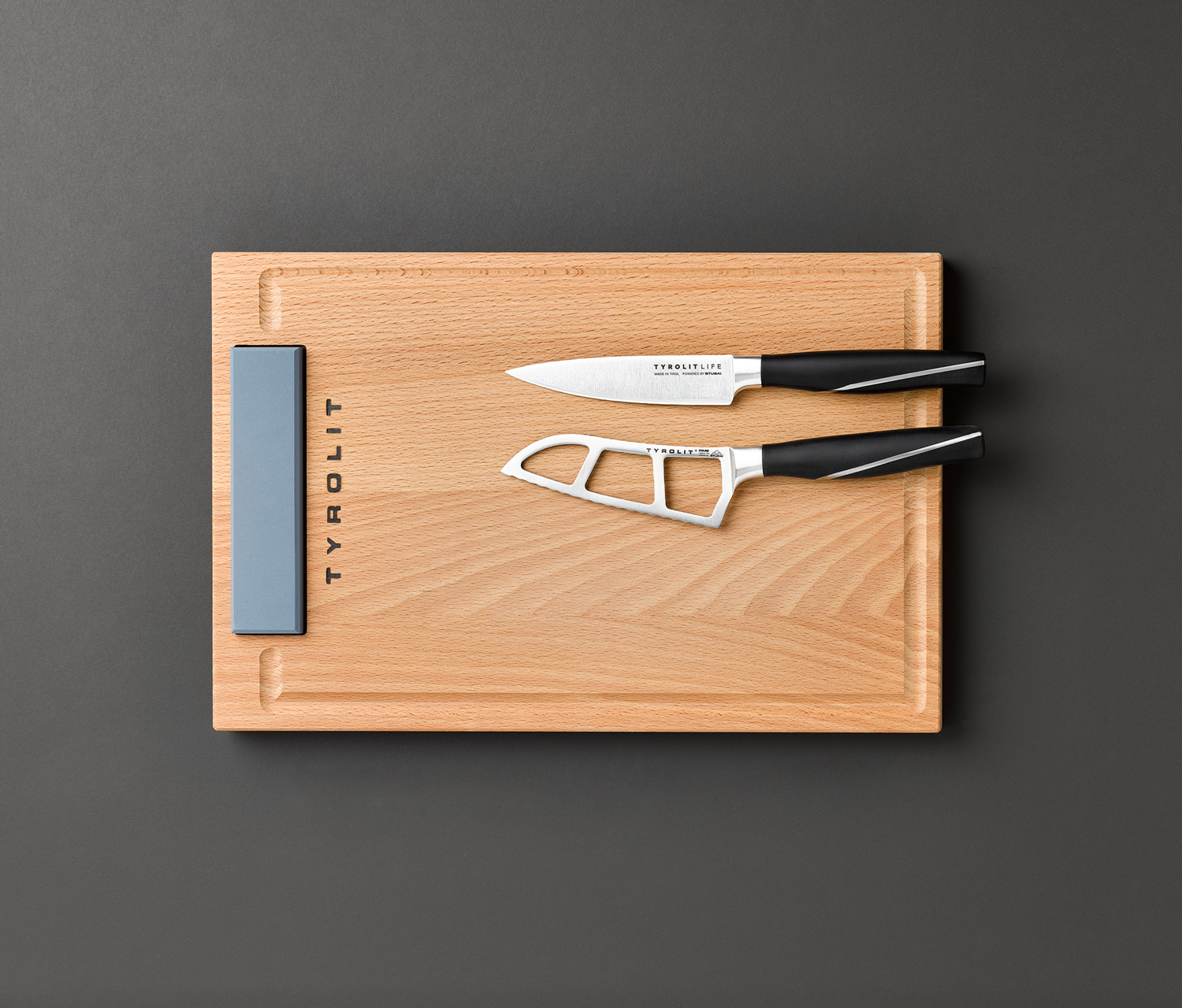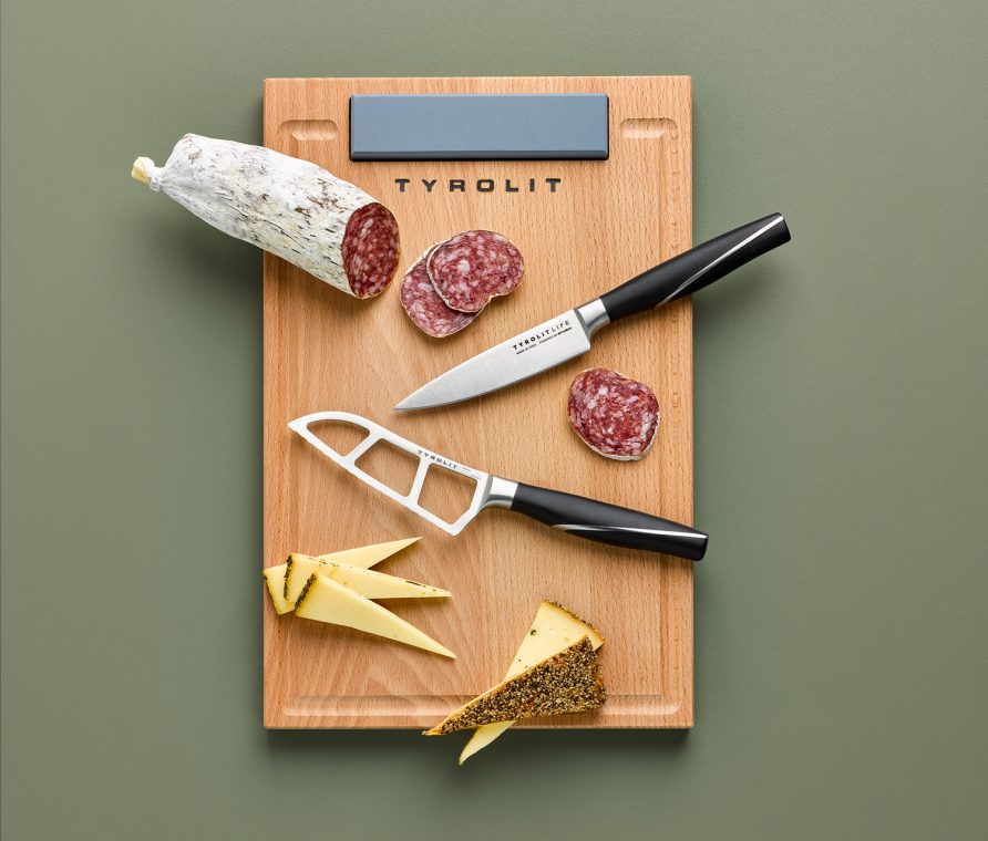 Dem Prinzip der Vereinfachung folgend hat TYROLIT LIFE zwei essentielle Bereiche in einem Werkzeug vereint – die ideale Schneidunterlage für eine richtige Tiroler Jause.