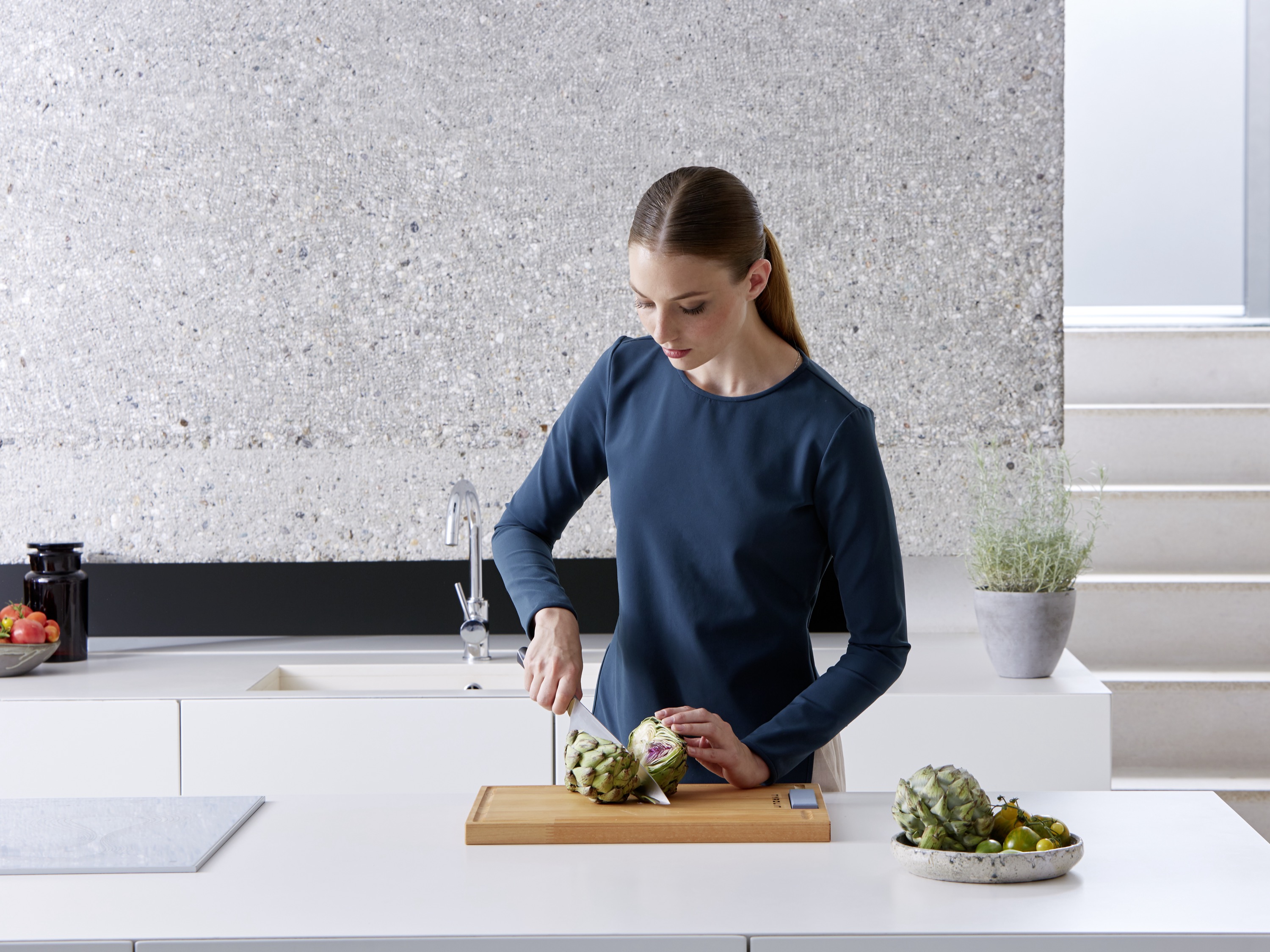 Während Daumen und Zeigefinger das Ende der Klinge stabilisieren, bleibt die Spitze des Messers immer auf dem Schneidbrett. Die Hand folgt einfach der Bewegung des 133 g leichten Messers wie der eines Schwungrades und sorgt damit für einen sauberen Schnitt.