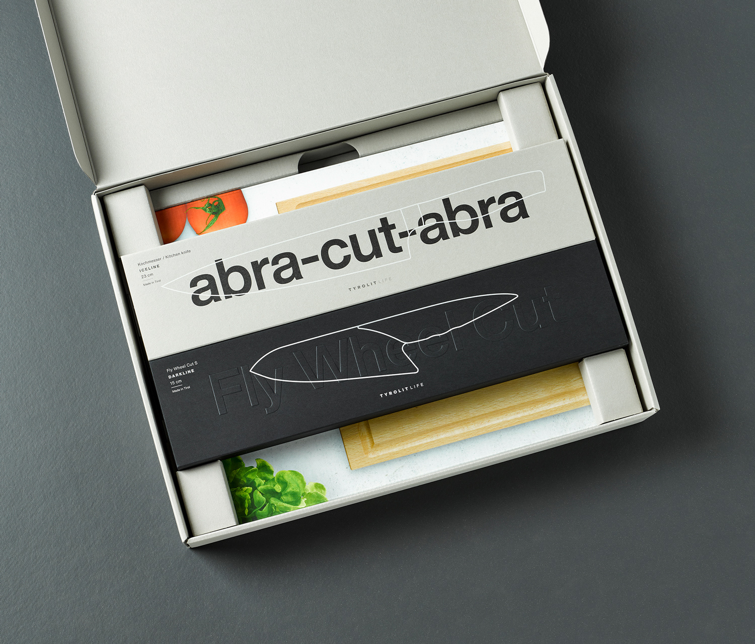 Die Geschenkboxen von Tyrolit Life sind eine besondere Überraschung für Hobbyköche und Profis. Liebevoll verpackt finden sich darin 1 Messer der Iceline Messerserie, 1 Messer der Darkline Messerserie und ein hochwertiges Schneidebrett mit integriertem Keramik-Schleifstein.